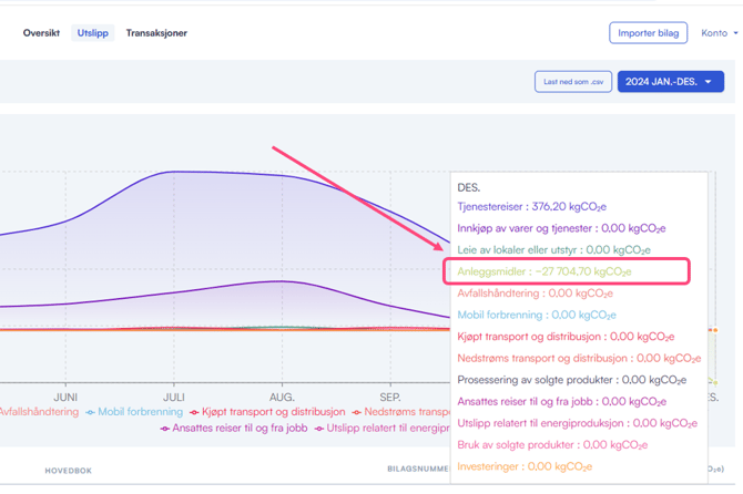 - Bruk grafen for å se hvilken kategori det negative utslippet ligger i. På bildet nedenfor vises det at det negative utslippet ligger i "Anleggsmidler". Dette kan ses ved å holde markøren over grafen med det negative utslippet eller ved å se i listen under grafen.