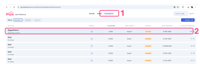 Når Klara har importert transaksjoner for en gitt periode, finner du dem under "Transaksjoner" i fanen "Avventer". Før utslippene vises i "Oversikt/Utslipp", må transaksjonene kontrolleres og deretter godkjennes.