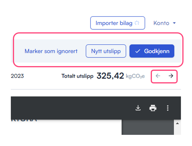 - Når alle utslipp er korrekte, eller transaksjonen skal ignoreres, gjør du dette ved å velge i menyen oppe i høyre hjørne. For å skifte mellom transaksjoner kan du bruke pilene.