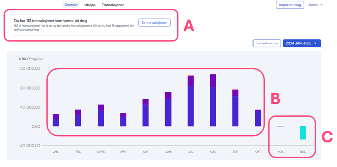 - Heretter går du til "Oversikt" for å se om noe fremstår som "unormalt". Dette kan for eksempel være negative utslipp. Nedenfor har vi laget et eksempel på hvordan du kan gå frem for å kontrollere transaksjonene for avvik.